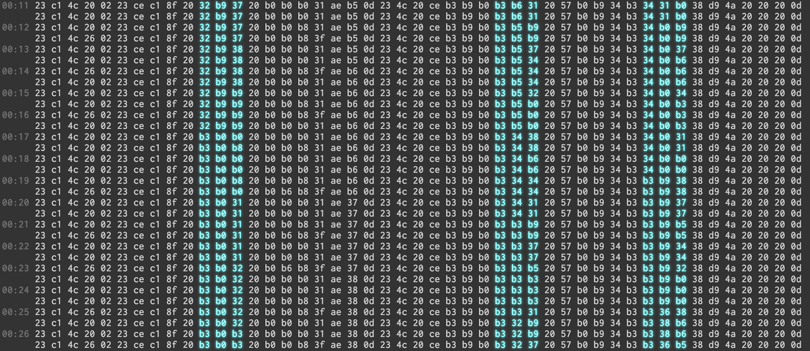 ![[Image: A time-stamped hex dump of the byte stream, arranged in packets with only a few bytes changing over time.]](https://4.bp.blogspot.com/-7JGKgsK7wWY/VFoRk5AGBnI/AAAAAAAADlE/XTP_y_kA1H4/s460/kopteri-bitit2.png)